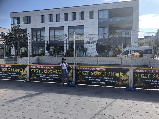 Neben einem Bungee Run und einen XXL Tischkicker wurde auch ein Street Soccer Court mit den Maßen 15x10m aufgebaut. Die Besonderheit bei diesem Court war die Anbringung eines Deckelnetzes, so dass der Court komplett als geschlossenes Spielfeld diente. Ein Deckelnetz empfehlen wir besonders bei Event im Stadtkern mit umliegenden Ständen oder Geschäften.